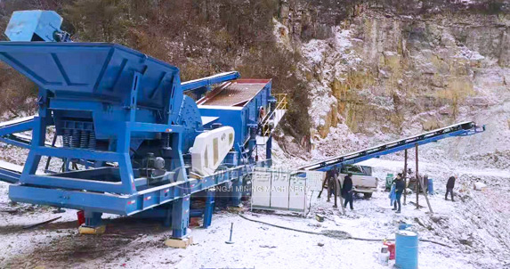 移动锤式破碎机工作时,由铲车将物料装入振动给料机,再由振动给料机将物料均匀的输送至重锤式破碎机机舱内,重锤式破碎机转子带动板锤连续撞击物料,当物料达到一定粒度后从机体下方排出输送至振动筛,合格的物料通筛子筛选后输送至成品物料堆放区,不合格的物料则进行再次破碎。
