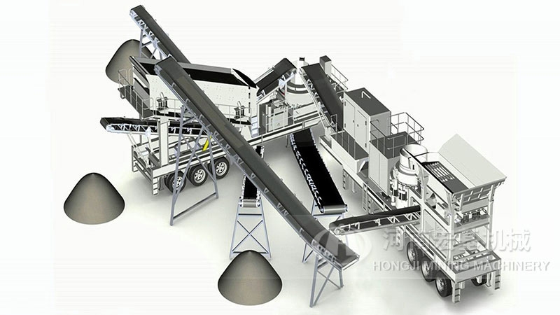 其相当于一条可移动的机制砂生产线,一台机器可以同时带着进料,破碎,制砂,输送和筛选等设备。并且该机的底盘选用全钢轮船结构,健壮,承载才能较强。空间设计合理,还可依据用户对成品的要求,进行更加灵活的工艺调整,但是价格较高。